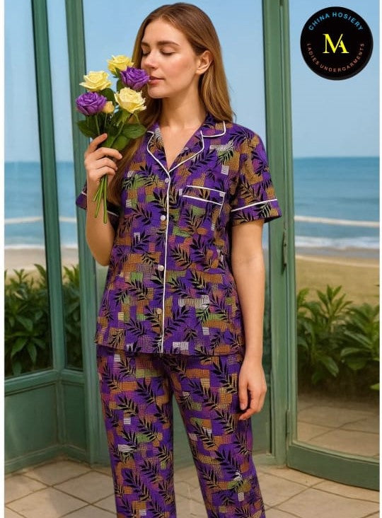This Purple Printed Pyjama Set brings together comfort and fashion, making it an essential addition to every woman’s nightwear collection
