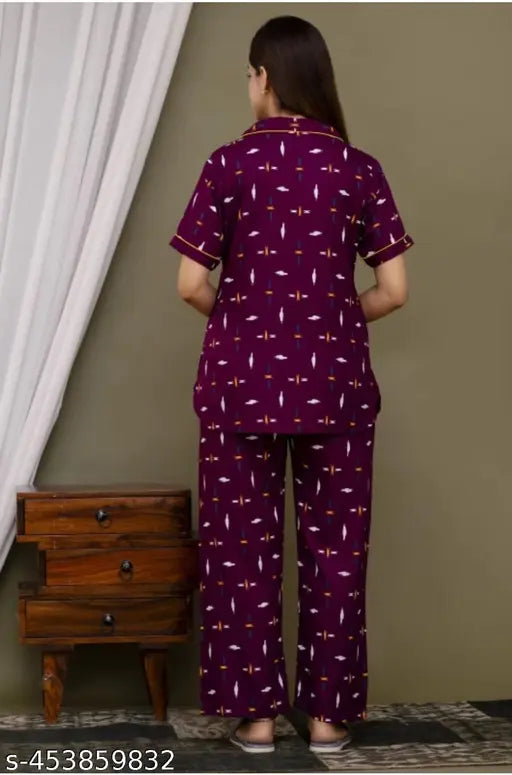 Women’s Purple Printed Shirt & Pyjama Set – Stylish Nightwear